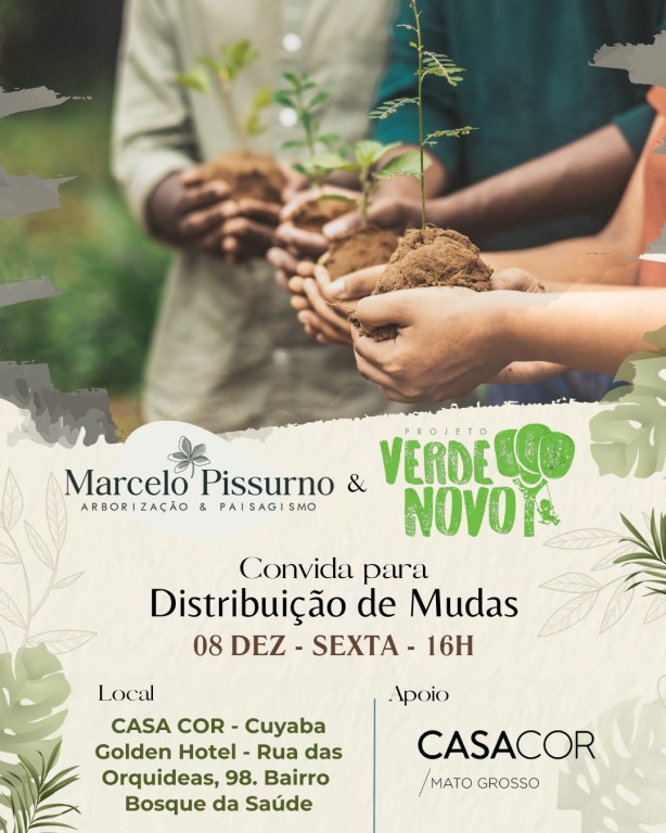 #ParaTodosVerem – Esta matéria possui recursos de texto alternativo para promover a inclusão das pessoas com deficiência visual. Banner de arte digital vertical dividida em uma parte superior e uma inferior. Na superior, há uma foto com quatro pessoas com as mãos estendidas segurando montinhos de terra onde há brotos de mudas plantados. Na parte inferior, de fundo branco e ornamentos em formato de folhas, as logos Marcelo Pissurno Arborização e Paisagismo e Verde Novo convida para distribuição de mudas 08 dez – sexta – 16h local Casacor – Cuyaba Golden Hotel – Rua das Orquideas, 98. Bairro Bosque da Saúde. Apoio CASACOR/Mato Grosso.