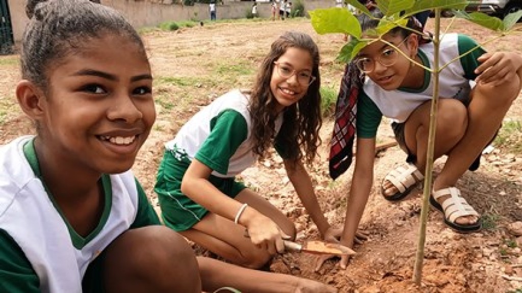 Esta matéria possui recursos de texto alternativo para promover a inclusão das pessoas com deficiência visual. Descrição da imagem 1: alunas da escola plantando uma muda de árvore, elas estão ao redor da muda com as mãos na terra e, uma delas, segura uma pá. Imagem 2: foto na horizontal colorida, o palhaço responsável pelo jogo ecológico Rebojando está ao centro, sobre um tabuleiro ecológico, apontando as mãos para as crianças, que estão sentadas em volta do tabuleiro, e a engenheira florestal aparece ao fundo.