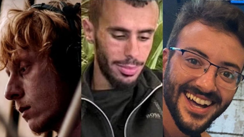 Israelenses Yotam Haim, Samar Talalka e Alon Shamriz (da esquerda para a direita) foram sequestrados pelo Hamas e mortos por engano pelo exército de seu próprio país