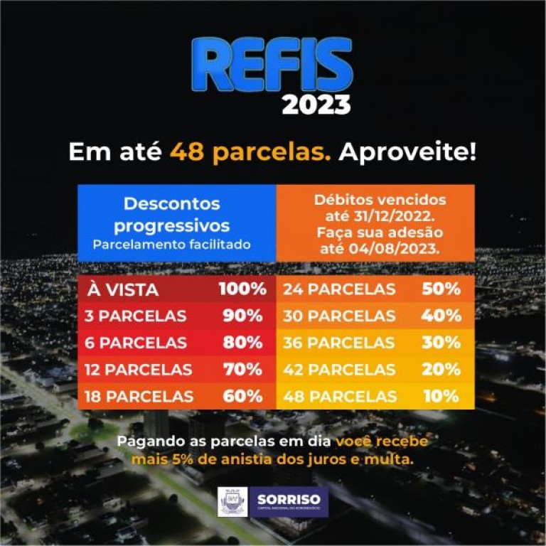 Assim como em versões anteriores, o Refis 2023 conta com dez opções para que os contribuintes inadimplentes possam quitar suas dívidas. Para os que escolherem pagar a dívida em cota única, haverá anistia total de juros e multa. Já para o pagamento em três parcelas, a redução é de 90% dos juros e multas. Quem dividir o débito em seis cotas, terá o desconto de 80% dos juros e multas. Também é possível negociar o pagamento ao longo de 12 meses, com a redução de 70% de juros e multas.