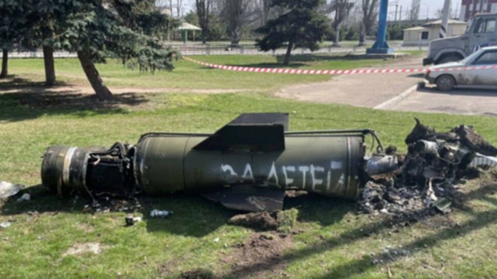Restos de um míssil do lado de fora da estação ferroviária de Kramatorsk, na Ucrânia