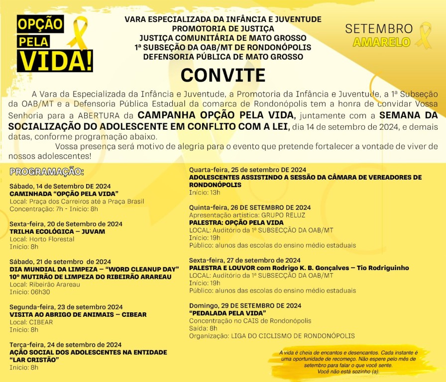 Pelo segundo ano consecutivo, a Comarca de Rondonópolis (217 km de Cuiabá), por meio da Vara Especializada da Infância e Juventude em parceria com a Promotoria de Justiça, Defensoria Pública, Justiça Comunitária e 1ª Subseção da OAB-MT, realiza entre os dias 14 e 29 de setembro, da campanha “Opção pela Vida”, iniciativa que faz parte da campanha “Setembro Amarelo”.