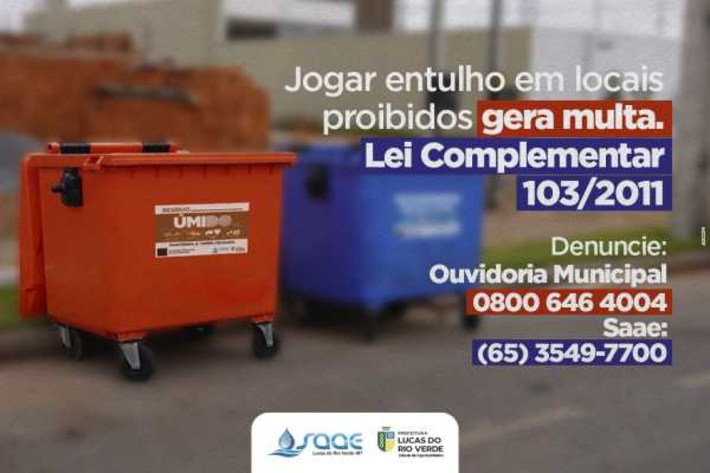 O Serviço Autônomo de Água e Esgoto (Saae) de Lucas do Rio Verde, segue reforçando a necessidade e conscientização da população quanto ao descarte correto de lixo e entulho.