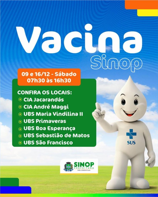 A Prefeitura de Sinop por meio da Secretaria de Saúde irá realizar, ainda neste mês de dezembro, mais dois sábados com a ação de vacinação. Serão sete pontos para atender a população em horário diferenciado para que todos possam atualizar a caderneta e com isso aumentar a cobertura vacinal do município.