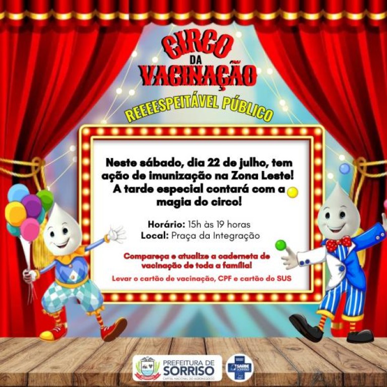 Nesse sábado, 22 de julho, será realizada mais uma edição do programa “Vacina na Praça”. Desta vez o palco será a Praça da Integração. Das 15 às 19 horas, as equipes da Secretaria de Saúde e Saneamento estarão no espaço – e o circo também! Sim, haverá mágicos, palhaços e muita brincadeira por lá!; para imunizar a família toda, desde recém-nascidos a idosos.