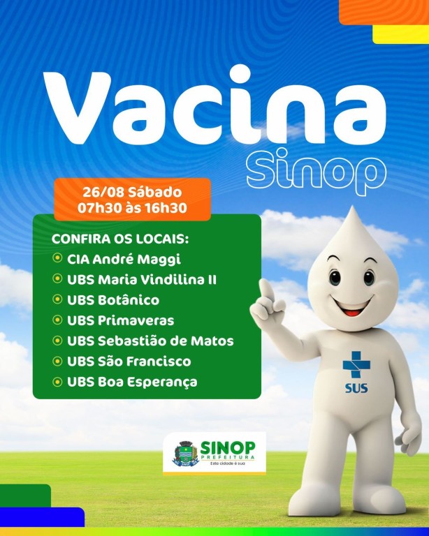 Estarão abertas as salas de vacina do Centro Integrado de Atendimento (CIA) André Maggi, e as Unidades Básicas de Saúde (UBS’s) dos bairros: Botânico, Maria Vindilina II, Primaveras, Sebastião de Matos, Boa Esperança e São Francisco, das 7h30 às 16h30.