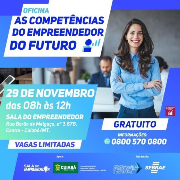 No próximo dia 29 de novembro, a Prefeitura de Cuiabá por meio da Secretaria Municipal de Agricultura, Trabalho e Desenvolvimento Econômico, vai realizar a oficina “As Competências do Empreendedor do Futuro”, na Sala do Empreendedor, localizada no Cuiabanco, no Centro da Capital. A oficina é uma parceria entre a Prefeitura de Cuiabá e o Serviço Brasileiro de Apoio às Micro e Pequenas Empresas (Sebrae) e tem como objetivo promover a reflexão do participante quanto às suas competências técnicas e comportamentais atuais, e estimular o próprio desenvolvimento alinhado às tendências do mercado necessárias para um posicionamento competitivo no mercado empresarial e de trabalho.