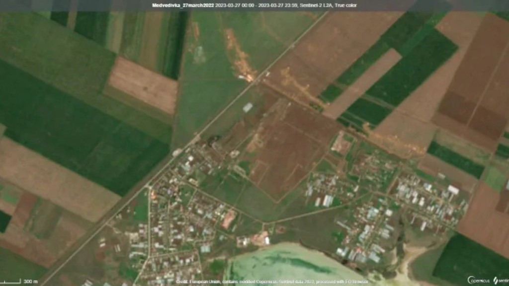 As imagens do satélite Sentinel 2, da União Europeia, mostraram o esvaziamento de uma base militar russa no norte da Crimeia. As tropas da Rússia estavam perto da vila de Medvedivka, na fronteira com a região de Kherson, ao qual abrigava um grande número de blindados do país.