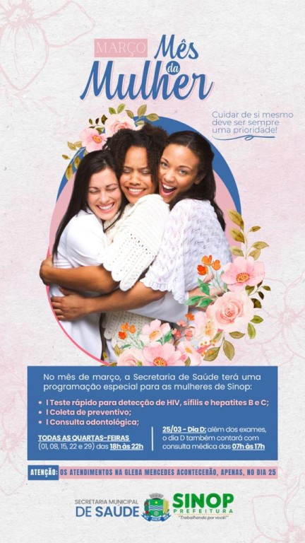 Em comemoração ao mês dedicado à mulher, a Prefeitura de Sinop, ;por meio da Secretaria de Saúde, está com programação especial neste sábado (25). Todas as unidades básicas de saúde, inclusive da Gleba Mercedes, ;e os Centros Integrados de Atendimentos, estarão abertos das 7h às 17h.