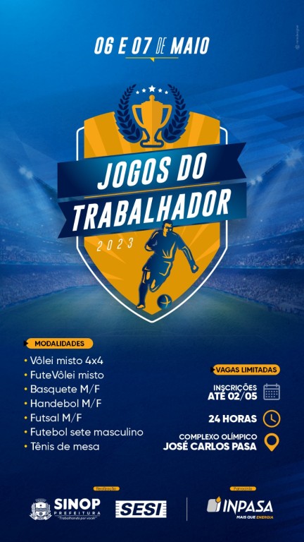 As equipes interessadas em participar dos Jogos do Trabalhador 24h, edição 2023, têm até hoje (2) para se inscreverem na competição, em várias modalidades. O evento é uma parceria da Prefeitura de Sinop, com o Serviço Social da Indústria (Sesi MT) e apoio da Inpasa, e será realizado no próximo final de semana, dias 06 e 07 de maio (sábado e domingo), no Centro Olímpico José Carlos Pasa.
