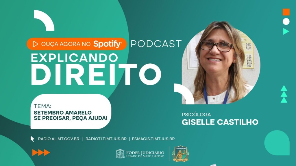 Esta matéria possui recursos de texto alternativos para promover a inclusão de pessoas com deficiência visual. Descrição da imagem: Fotografia retangular e colorida. Na lateral esquerda, o texto ‘Ouça agora no Spotify!’. No canto superior direito, a palavra “Podcast” está destacada. No centro da imagem, aparece o nome do programa “Explicando Direito”, uma foto da convidada, o tema do programa “Setembro Amarelo” e o nome da convidada, Psicóloga Giselle Castilho. Na parte inferior, são fornecidos os endereços eletrônicos da Rádio Assembleia, Rádio TJ e Escola da Magistratura. O logotipo do Poder Judiciário de Mato Grosso e da Esmagis-MT assinam a peça.