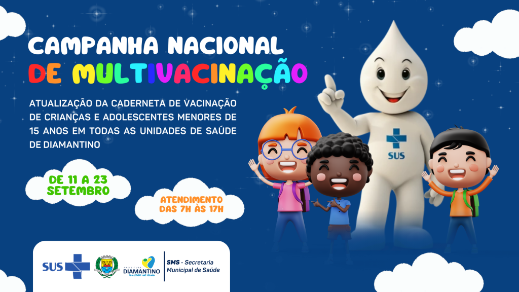 Manter a vacinação de crianças e adolescentes em dia é fundamental para a prevenção de doenças. Pensando nisso, a Prefeitura de Diamantino, por meio da Secretaria Municipal de Saúde, informa o início da Campanha Nacional de Multivacinação. O objetivo é atualizar a caderneta de vacinação de crianças e adolescentes menores de 15 anos (14 anos 11 meses e 29 dias).