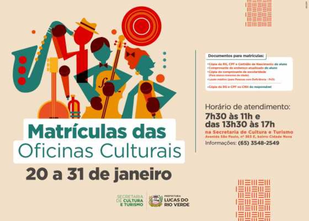 A Secretaria de Cultura e Turismo de Lucas do Rio Verde inicia, na próxima segunda-feira (20), o período de matrículas para as oficinas culturais destinadas a novos alunos. As aulas, oferecidas anualmente de forma gratuita, atendem crianças, adolescentes e adultos do município, com vagas limitadas.