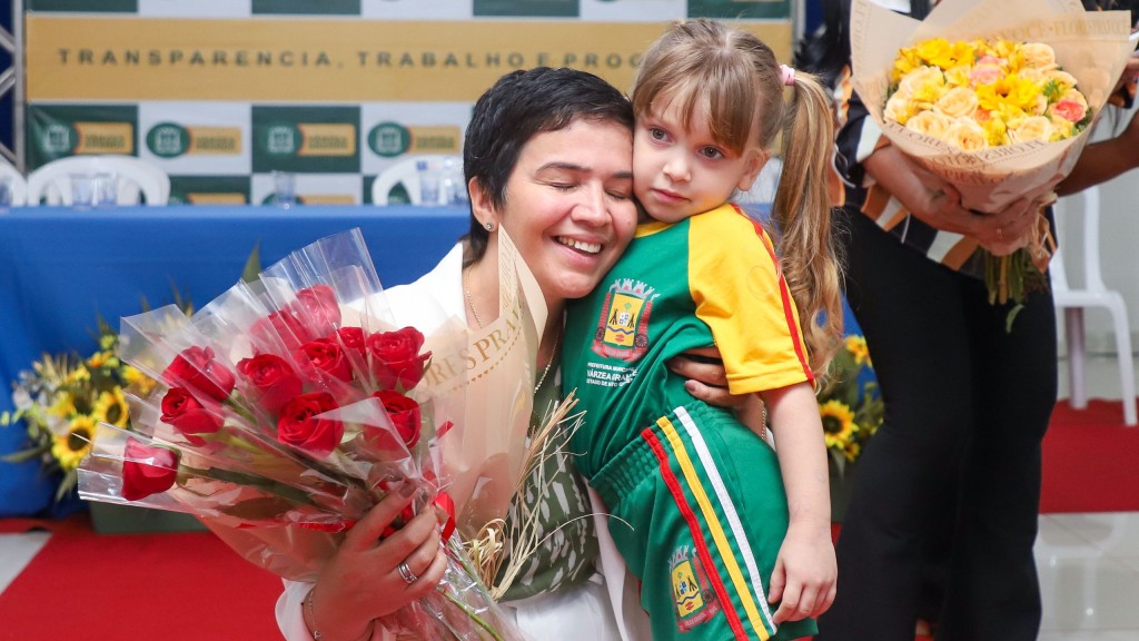 A secretária Maria Fernanda também foi homenageada. Recebeu um buquê de flores de uma estudante, representando os alunos da rede municipal de Várzea Grande.