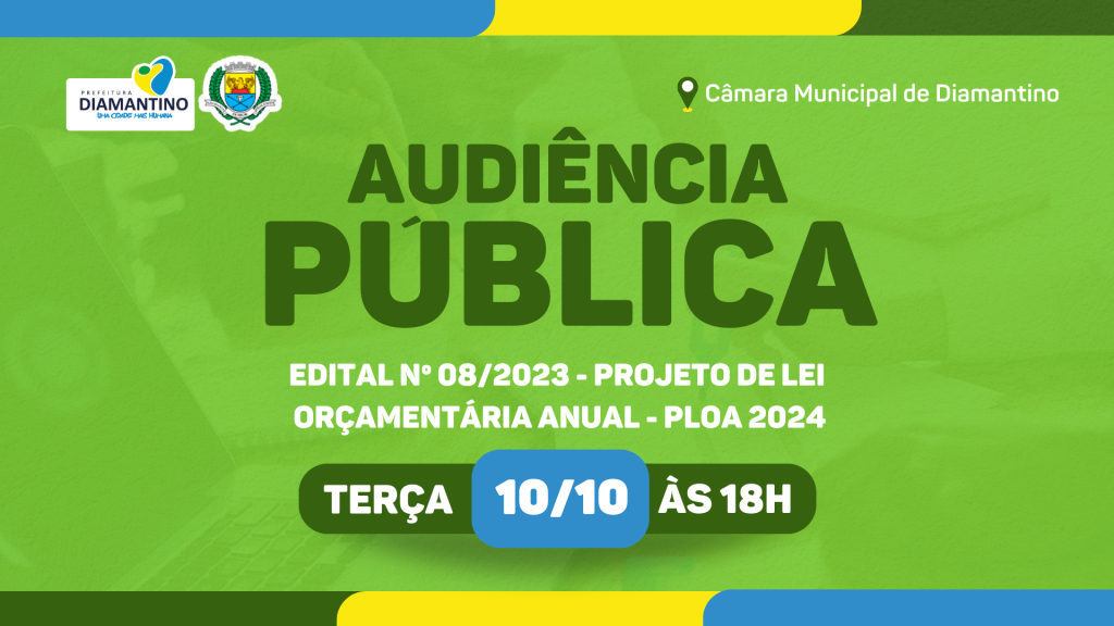 A Prefeitura de Diamantino, por meio da Secretaria Municipal de Fazenda, promove nesta terça-feira (10.10), às 18 horas, a Audiência Pública para Elaboração e Discussão do Projeto de Lei Orçamentária Anual para 2024.