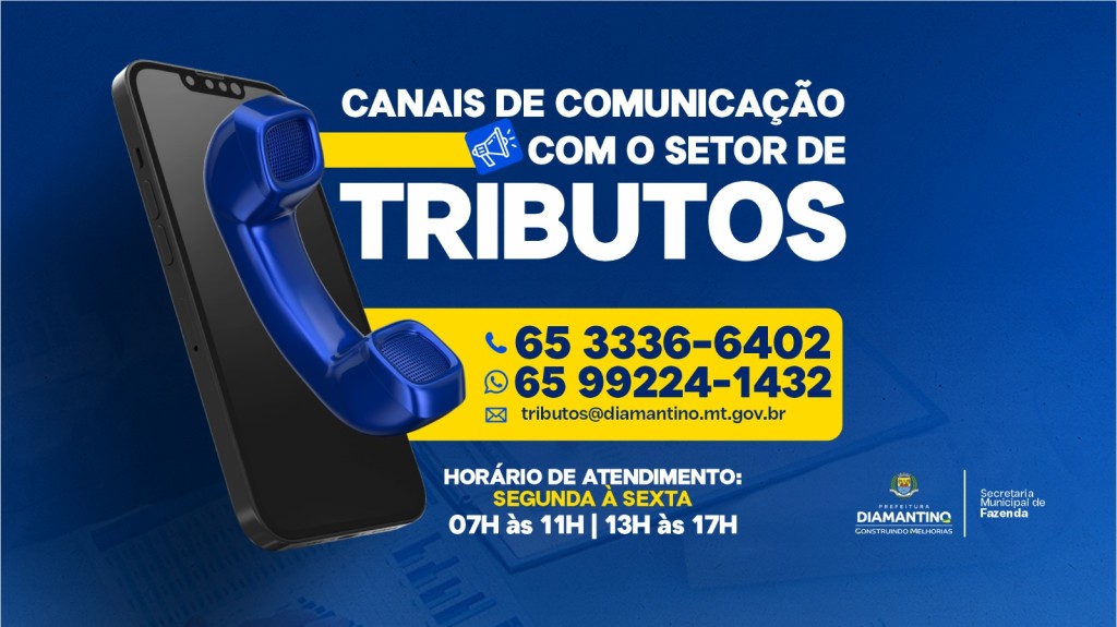 Para mais informações, o contribuinte pode procurar a Secretaria Municipal de Fazenda na sede da Prefeitura, Avenida JPF Mendes, n° 2287 Jardim Eldorado, ou entrar em contato de segunda a sexta-feira das 7h às 11h e das 13h às 17h pelos fones (65) 3336 – 6402 ou (65) 9 9224 – 1432 e e-mail tributos@diamantino.mt.gov.br.