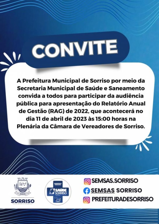 A Prefeitura de Sorriso, através da Secretaria de Saúde e Saneamento, realiza na terça-feira, 11 de abril, a audiência pública para apresentação do Relatório Anual de Gestão (RAG) de 2022.