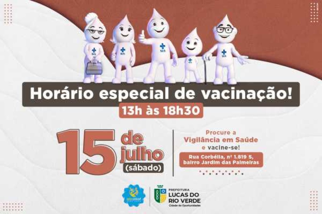 A Secretaria de Saúde de Lucas do Rio Verde informa que, neste sábado (15), terá vacinação, das 13h às 18h30, na Vigilância em Saúde. Os imunizantes disponíveis serão: Gripe , Bivalente Covid (pessoas acima de 18 anos e grupo prioritário), Covid-19 Coronavac (a partir de 3 anos), Pfizer Baby (para crianças de 06 meses a 4 anos) e Janssen (pessoas acima de 18 anos), além das vacinas de rotina.