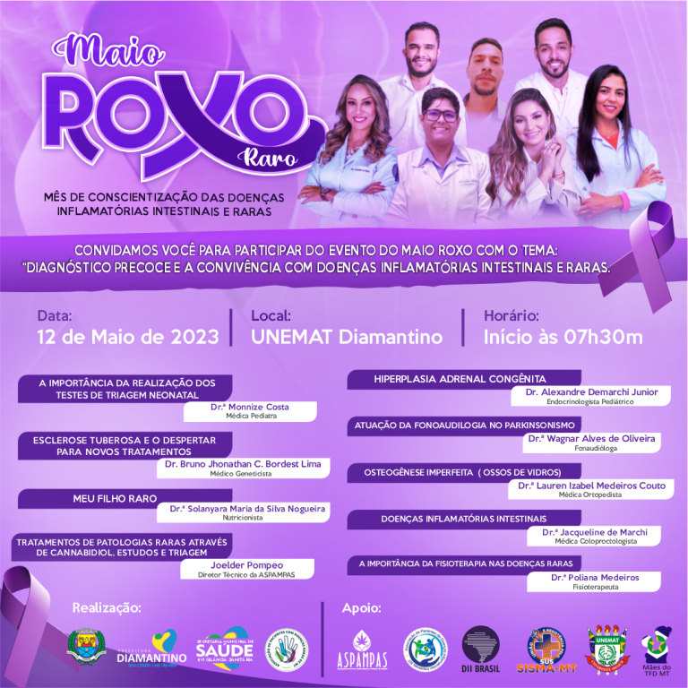 O mês de maio é dedicado à prevenção e conscientização das Doenças Inflamatórias Intestinais – DIIs. Pensando nisso, a Prefeitura de Diamantino (MT), por meio da Secretaria Municipal de Saúde em parceria com a Associação de Doenças Raras de MT, promove, nesta sexta-feira (12.05) na UNEMAT Diamantino, o evento em alusão ao Maio Roxo com o tema “Diagnóstico Precoce e a Convivência com Doenças Inflamatórias Intestinais e Raras”, que reunirá a apresentação de 09 especialistas na área.
