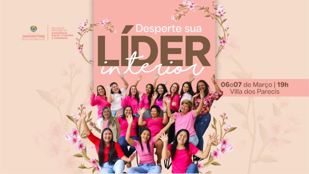 Em celebração ao Dia Internacional da Mulher, a Prefeitura Municipal de Diamantino, por meio da Secretaria de Assistência Social, Trabalho e Cidadania em parceria com a Câmara Municipal de Diamantino, convida toda a população para o evento “Desperte sua Líder Interior”. A programação especial acontecerá nos dias 06 e 07 de março, a partir das 19h, no espaço Villa dos Parecis.