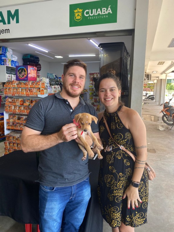 A foto mostra um casal sorridente segurando um filhote de cachorro no colo. O cachorro é pequeno, de cor marrom, com uma coleira vermelha, e está sendo segurado pelo homem. Ao fundo, há prateleiras com produtos, sugerindo que o local é uma loja, possivelmente uma feira de adoção de animais realizada em Cuiabá. O casal parece feliz e orgulhoso, destacando o momento com o filhote.