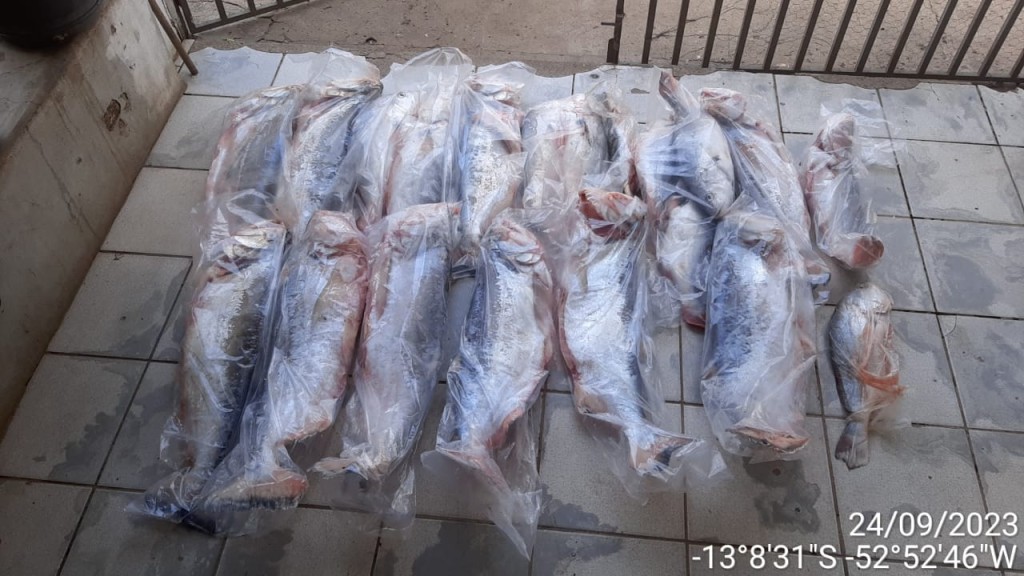 Já na comunidade de Estirão Comprido, na região de Barão de Melgaço, em patrulhamento terrestre e com o apoio da 3ª Companhia Independente de Polícia Militar (3ª CIPM), a equipe de fiscalização encontrou, em uma caminhonete Chevrolet S10, 163,6 kg de pescados descaracterizados, sem a cabeça e sem documentação comprobatória.