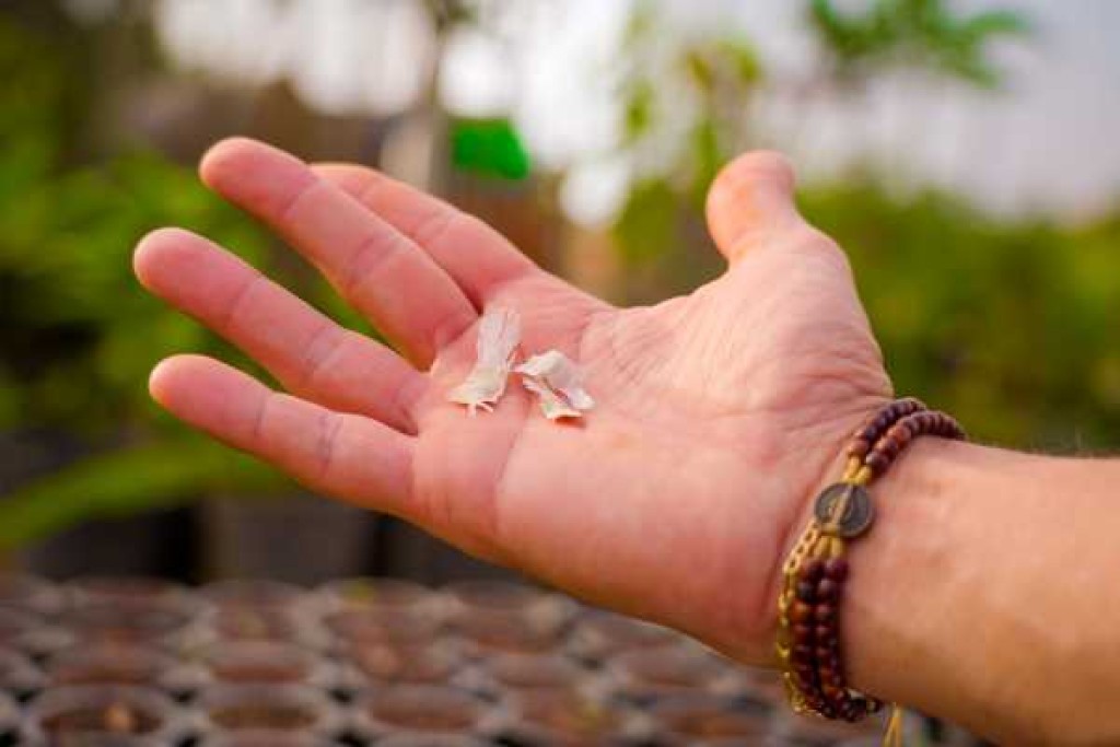 A germinação é variante de 5 a 12 dias e podendo aparecer de um broto por recipiente. Caso isto aconteça, poderá ser feito desbaste (retirada do broto) e colocando em outro recipiente com substrato.