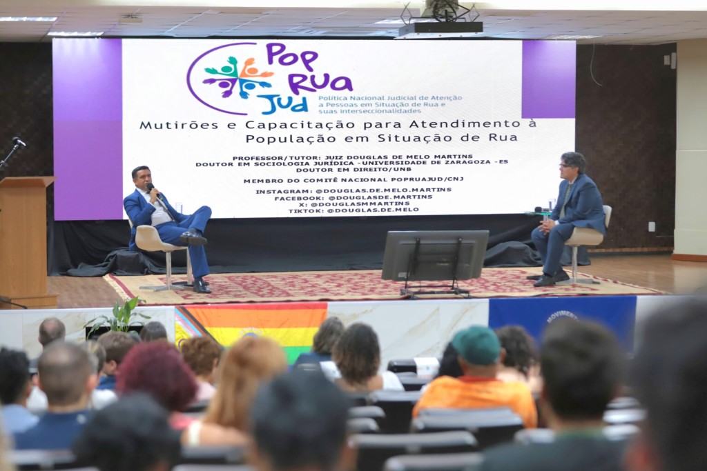 O palestrante foi o juiz e professor Douglas de Melo Martins, do Tribunal de Justiça do Maranhão, doutor em sociologia jurpidica pela Universidade de Zaragoza (Espanha) e doutor em Direito pela Universidade de Brasília (UnB), membro do Comitê Nacional PopRuaJud do Conselho Nacional de Justiça (CNJ).