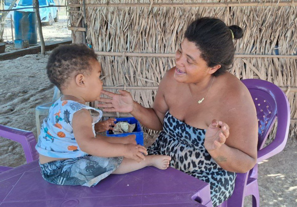 Thyara Savana Soares, moradora da Comunidade Veredas é mãe do pequeno Cristofer Caleb e Yohana Valentia, de um ano e dois meses e seis anos, respectivamente. A família é acompanhada pela equipe do Programa Criança Feliz, do município de Santo Antônio do Leverger e recebeu a visita das profissionais que estavam em treinamento. Ela destacou que as profissionais do programa auxiliam no desenvolvimento das crianças.