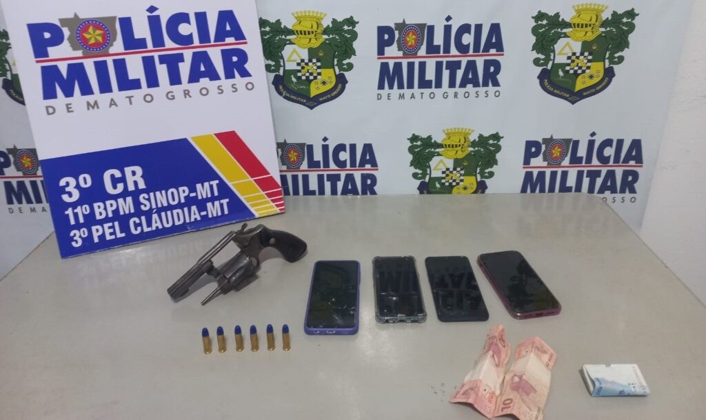 Policiais militares do 11º Batalhão prenderam, nesta terça-feira (14.03), três homens e quatro mulheres, sendo uma adolescente de 15 anos, por formação de quadrilha, tentativa de roubo e porte ilegal de arma de fogo no município de Cláudia (567 km de Cuiabá). Na ação foram apreendidos um revólver calibre .38 e seis munições do mesmo calibre.