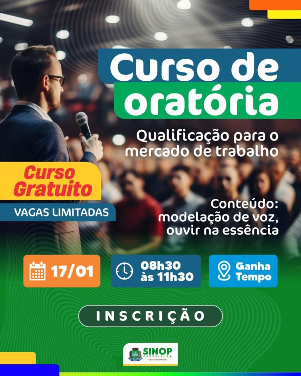 Para começar as ações de capacitação do ano, direcionadas à população do município, o Sine promove, na próxima quarta-feira (17), um Workshop em oratória. Com 15 vagas abertas, as inscrições são gratuitas e podem ser feitas por meio do site oficial da Prefeitura Municipal pelo link https://sistema.sinop.mt.gov.br/Login/.