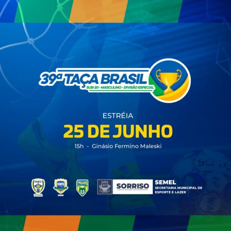 O Município recebe a partir deste domingo (25), a 39ª Taça Brasil Sub-20 masculino, Divisão Especial de Futsal. A competição acontece até o dia 01 de julho e reunirá 10 clubes, de nove estados, sendo, Paraná, Minas Gerais, Roraima, São Paulo, Ceará, Pará, Pernambuco, Distrito Federal e Mato Grosso.