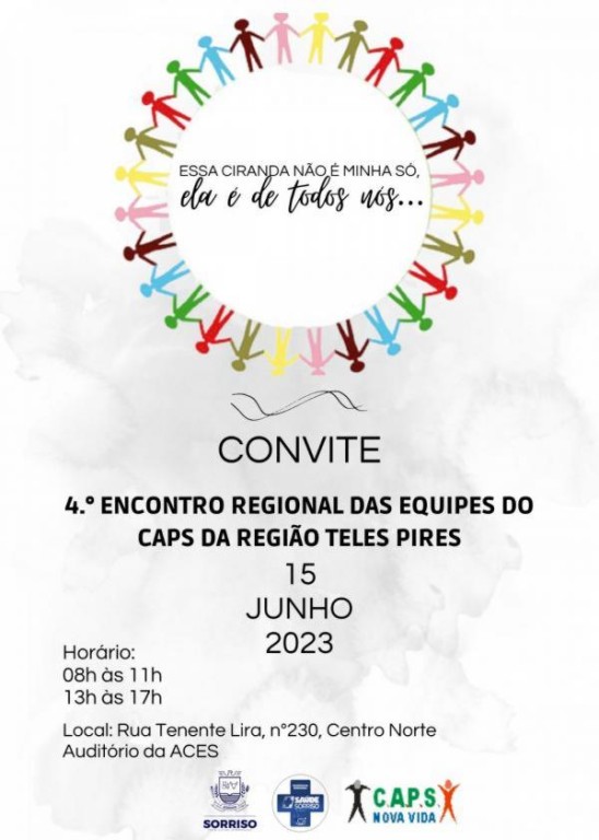 Nessa quinta-feira, 15 de junho, não haverá atendimento no Centro de Atenção Psicossocial Nova Vida|Maria Zélia da Silva Cosmos (Caps) de Sorriso. Mas calma que o motivo é bom! É que na data toda a equipe estará em formação, buscando aprimorar o atendimento durante o 4.º Encontro dos Centros de Atenção Psicossocial (Caps) da Região do Teles Pires. E o evento será aqui em Sorriso mesmo, no auditório da Associação Comercial e Empresarial de Sorriso (Aces).