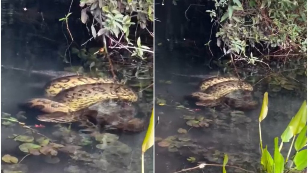 Um guia de turismo em Bonito, cidade no Mato Grosso do Sul, Eder Patrocinio da Cruz, registrou uma cena surpreendente durante o passeio de flutuação. No rio, ele filmou o momento que uma sucuri enrolada em um porco-do-mato.