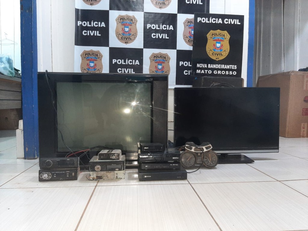 Na casa foram encontrados diversos objetos furtados, entre eles quatro aparelhos de som automotivo, televisores, caixa de som e receptores de TV.