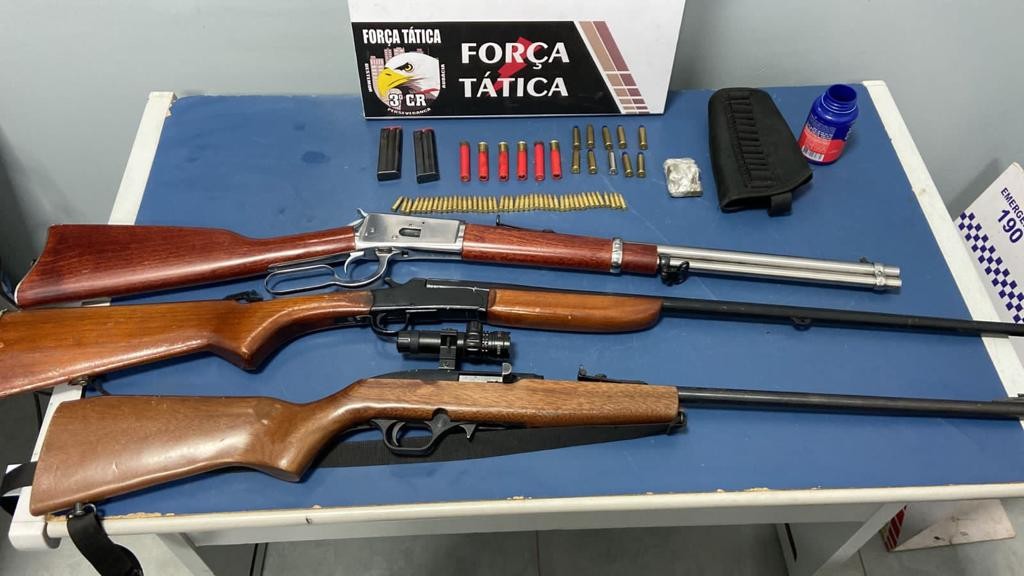 Ainda na casa, foram apreendidos uma carabina calibre 357, uma espingarda calibre 36, um rifle calibre 22 e 55 munições de diversos calibres, além de uma porção de maconha. A carabina havia um registro de roubo, no município de Terra Nova do Norte.