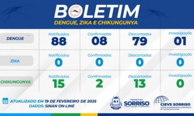 De 1.º de janeiro até o momento, Sorriso registrou 20 casos de dengue e dez de chikungunya, não houve registros de zika. Dos casos de dengue...