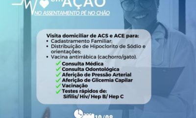 O “Saúde em Ação” estará no Assentamento Jonas Pinheiro no próximo dia 10 de agosto. O evento contará com várias ações simultâneas como visitas domiciliares de...