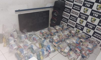 Policiais militares do 12º Batalhão apreenderam, neste domingo (16.04), 82 porções de maconha, uma arma de fogo tipo revólver calibre 38, munições e 30 cestas básicas,...