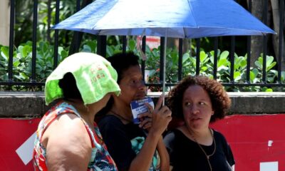 Tânia Rêgo/Agência Brasil – 12/11/2023 Candidatos se protegem do forte calor enquanto aguardam abertura dos portões para o segundo dia provas do Enem 2023, na Universidade...