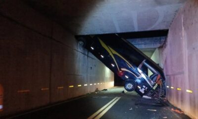 Reprodução/Roberto Torrecilhas Ônibus caiu no retorno que passa sob a rodovia Na madrugada deste domingo, um ônibus de turismo caiu no vão de um viaduto da...