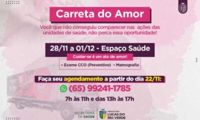 Lucas do Rio Verde recebe na próxima semana a Carreta do Amor. Serão realizados os exames de mamografia e preventivo de colo de útero. A ação...