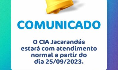 A Secretaria de Saúde comunica que, durante esta semana, o Centro Integrado de Atendimento (CIA) Jacarandás, estará fechado para reparos emergências. Os atendimentos retornam ao normal...