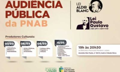 A Secretaria de Cultura e Turismo de Lucas do Rio Verde convida os produtores culturais para participarem da Audiência Pública da PNAB sobre a implantação das...