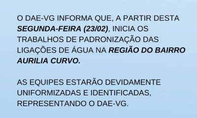 O Departamento de Água e Esgoto (DAE-VG) iniciou nesta semana a padronização das ligações de água no bairro Aurília Curvo. As equipes estão uniformizadas e identificadas....