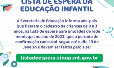 A Secretaria de Educação, Esporte e Cultura informa aos pais que fizeram o cadastro de crianças de 0 a 3 anos, na lista de espera para...