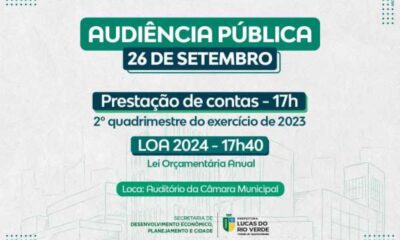 A Prefeitura de Lucas do Rio Verde promove, na última semana de setembro, a audiência de prestação de contas do 2º quadrimestre de 2023. Na sequência,...