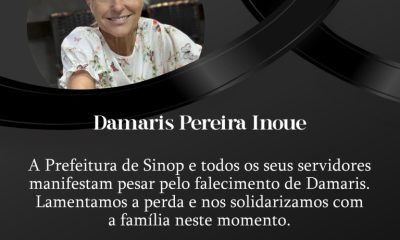 A Prefeitura Municipal de Sinop e o prefeito Roberto Dorner lamentam, com pesar, o falecimento de Damaris Pereira Inoue, de 65 anos, mãe do secretário de...