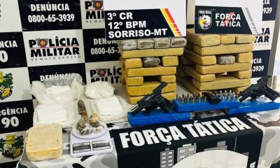Policiais militares da Força Tática do 12º Batalhão apreenderam, neste domingo (30.04), 35 tabletes de maconha, quatro de cocaína, um de pasta base, duas pistolas e...