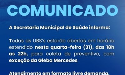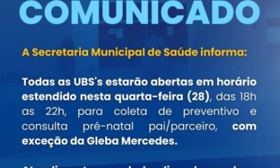 A Secretaria de Saúde informa que nesta quarta-feira (26), as UBS’s terão horário de atendimento estendido. Serão ofertados coleta de preventivo (papanicolau), com atendimento livre demanda,...